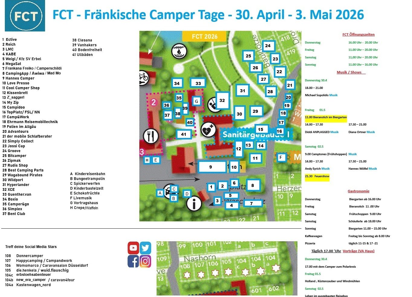 Auch 2026 sind bei den Fränkischen Camper Tagen wieder herzlich alle Tagesgäste willkommen! Kommt vorbei und erlebt die Faszination Camping hautnah. Euch erwarten über 50 Aussteller mit spannenden Fahrzeugen, cleveren Campinghacks und praktischem Zubehör. Lasst euch inspirieren, entdeckt Neues und genießt einen tollen Tag rund ums Camperleben. Wir freuen uns auf euch!